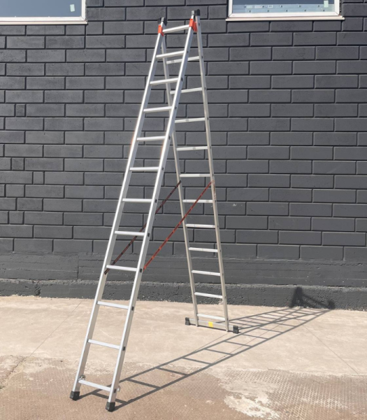 Лестница Техпром 2×12 ступеней универсальная состоит из двух частей или секций, соединенных между собой. Изготовлена из лёгкого, но прочного металла — алюминия, который не подвержен коррозии. В разложенном состоянии, когда лестница прислонена к стене, ее высота составляет 5,62 метра. Для устойчивости одна секция частично накладывается на другую. Когда лестница используется как стремянка, ее фиксируют специальные прочные ремни, чтобы она не разъезжалась. От скольжения по полу защищают резиновые наконечники. Эта модель не разбирается на отдельные части, поэтому использовать только одну секцию нельзя. Она немного тяжелее обычной односекционной лестницы, так как имеет более сложную конструкцию.
