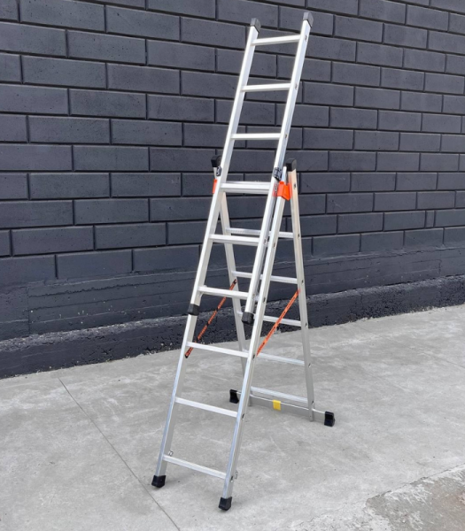 Алюминиевая трехсекционная лестница 3,37 м сочетает компактность, прочность и многофункциональность, что делает ее универсальным инструментом как для домашних задач, так и для профессионального использования. Она объединяет функции обычной лестницы и раздвижной модели. Её конструкция состоит из трёх частей: две секции образуют прочную раздвижную основу, а третья является съемной и может использоваться отдельно. В разложенном состоянии она обеспечивает рабочую высоту более 3 метров.
