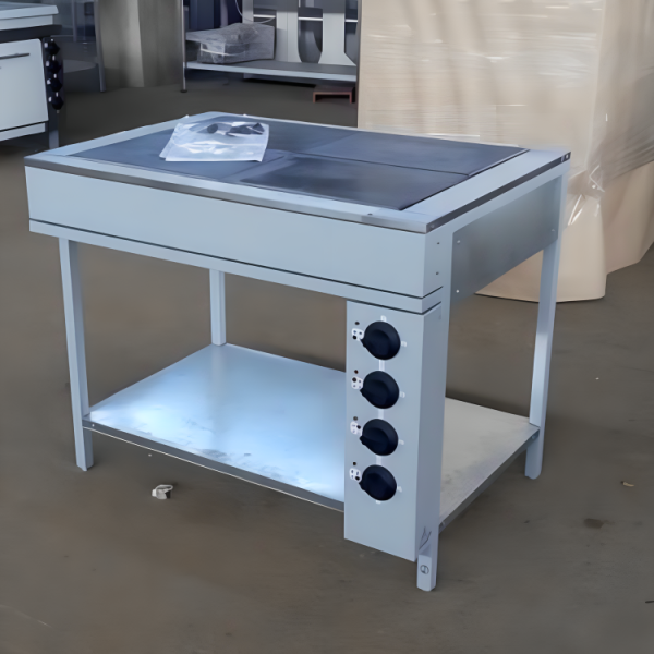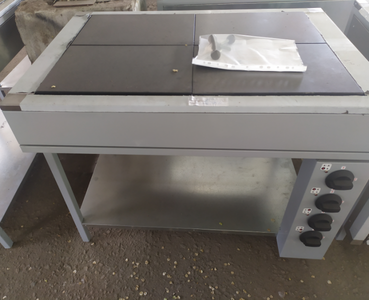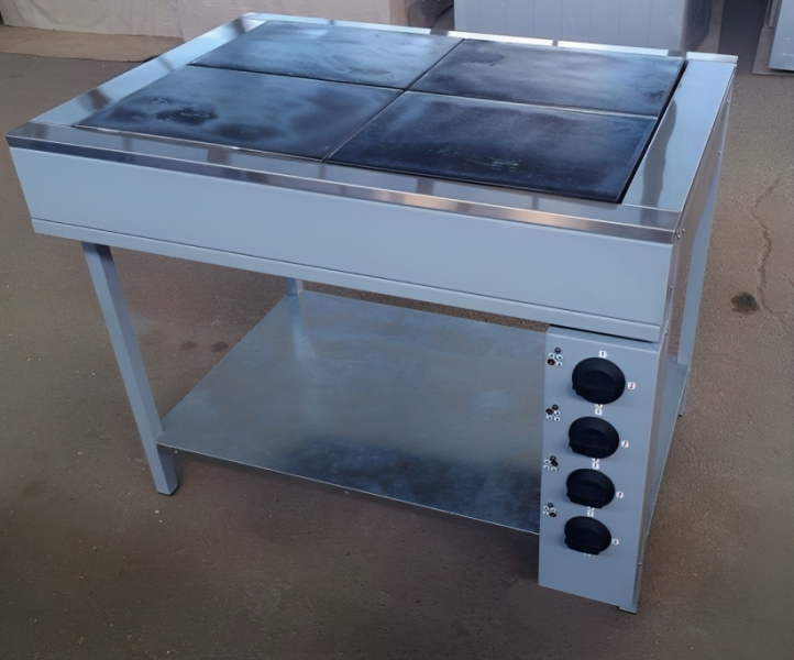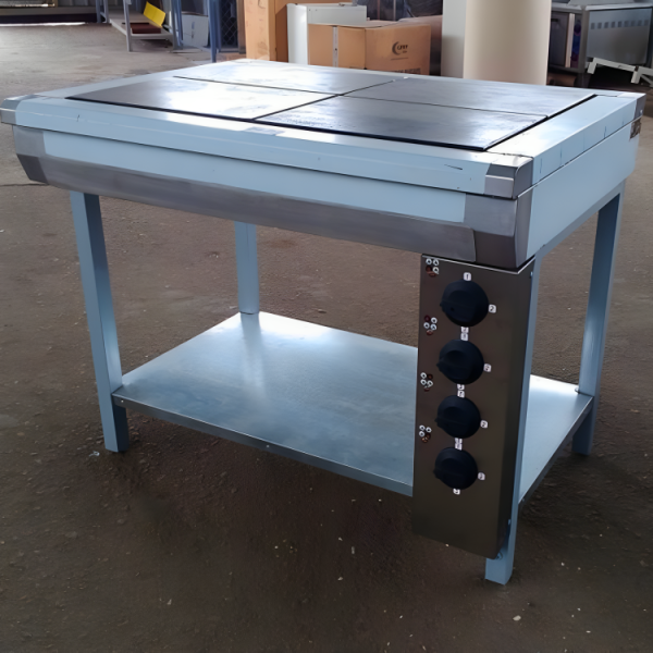 Электрическую плиту с 4 конфорками чаще всего используют на производствах, в кафе, ресторанах, столовых. Данный тип плиты рассчитан на длительную непрерывную работу. Представляет собой столешницу из нержавеющей стали с 4 прямоугольными конфорками, соединяющихся между собой в одну поверхность.