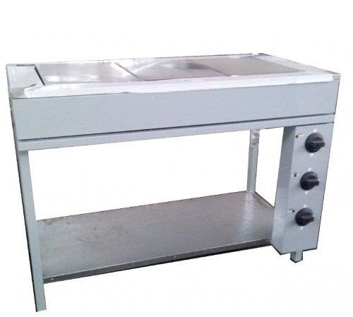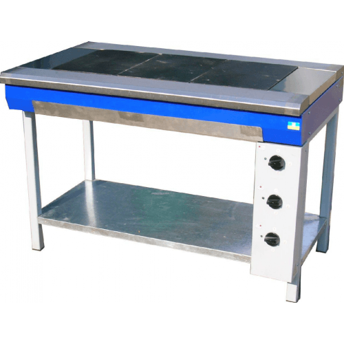 Плита электро, без духовки производственная, рассчитана на длительный цикл работы. 3 прямоугольные конфорки формируют одну сплошную рабочую поверхность. Каждая конфорка включается отдельно, с помощью реле расположенными сбоку на передней поверхности печки. Мощность работы каждой из конфорок 3 кВт.