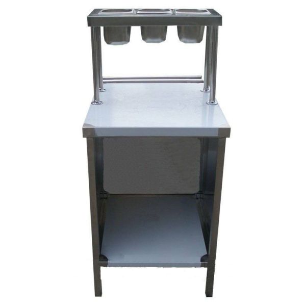 Устанавливается обычно в самом начале линии. Клиент подходя берет необходимые приборы и продвигаеться дальше. Ускоряет время на прохождение покупателем линии и позволяет меньше отвлекаться персоналу на обслуживание клиента.