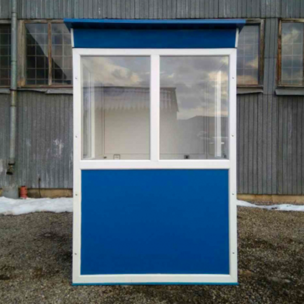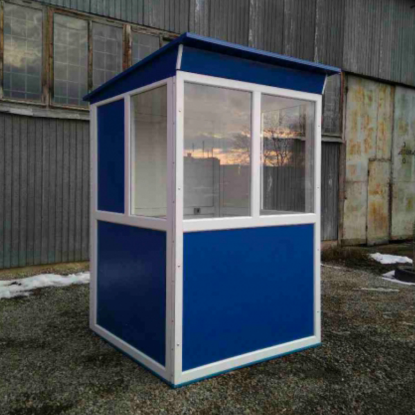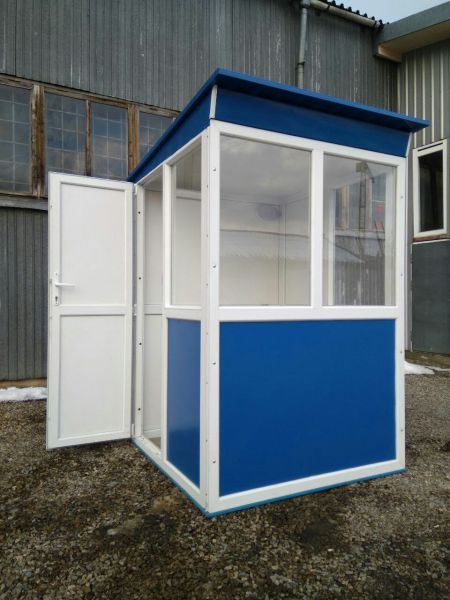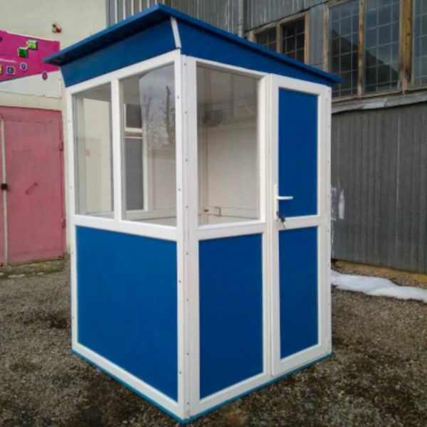 Будка для охраны с антивандальным покрытием устанавливается для обустройства контрольно-пропускных пунктов воинских частей, предприятий, полицейских участков, жилых комплексов, автостоянок. Каркас конструции выполеннн из металопластикого профиля, стены - из сендвич-панелей 32 мм, что позволяет сохранять температурный режим внутри (ефективно сохраняет тепло в холодное время года). Крыша односкатная из маталлопроффиля. Для большей прочности конструкции пластиковый профиль из которого изготавливается каркас - армирован металлическим профилем.