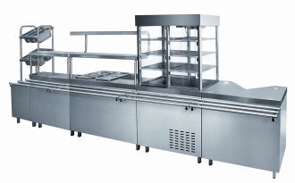 2. Нейтральний елемент. Обладнання призначено для зберігання і подачі холодних або нагрітих продуктів. Служить для розміщення салатів, закусок, холодних напоїв та інших блюд, які не вимагають підтримки певної температури. Можуть бути виконані у вигляді столиків, підставок або спеціальних модулів.