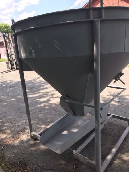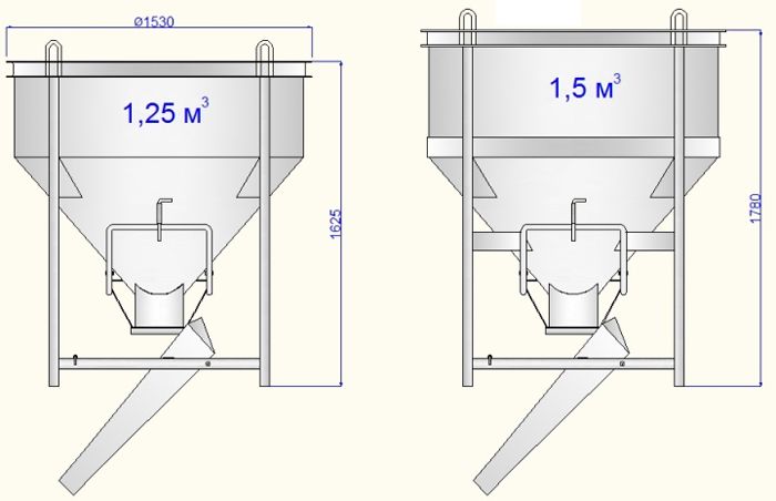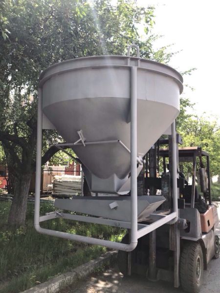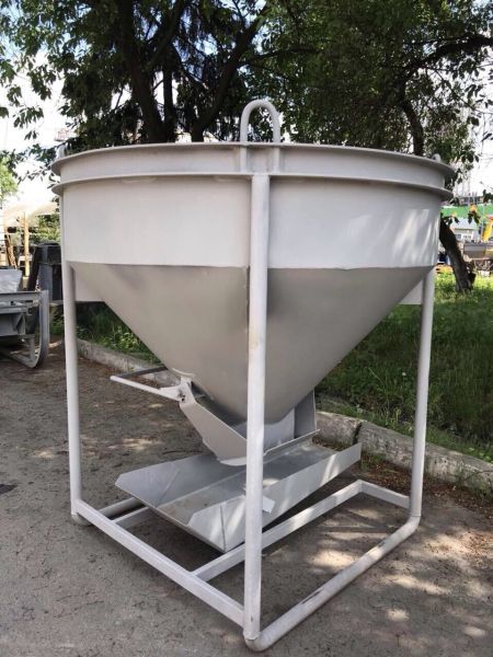 Баддя для бетону БН-1.25 (м3) - дзвіночок для заливки бетону та тимчасового зберігання або транспортування. Цебра має круглу форму усічену донизу. На кінці конуса встановлений фіксатор, призначений для зупинки потоку суміші. Також конусний бункер оснащений лотком для спрямування потоку суміші. Конструкція має чотири вантажні петлі для переміщення виробу на підйомному механізмі. Загальна вага порожньої конструкції складає 190 кг.