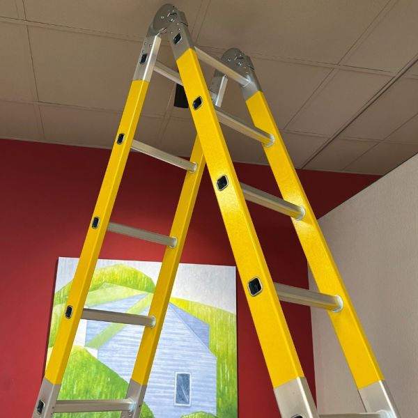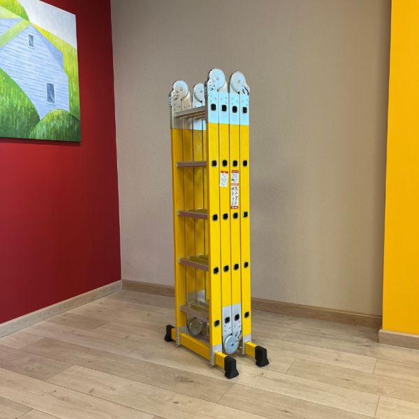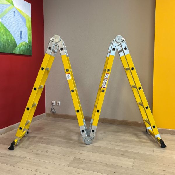 Драбина діелектрична 6,68 м шарнірна трансформер 4 × 6 сходинок — професійна шарнірна драбина трансформер для роботи на збільшеній висоті в умовах підвищених вимог до електробезпеки. Чотирисекційна конструкція забезпечує робочу висоту до 7,58 м і підходить для обслуговування промислових об’єктів, енергетичних установок і фасадних систем, де необхідна електроізоляція.