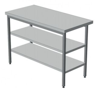 Стіл виробничий острівний (з двома полками) розміром 500 х 600 (мм) виготовлений з прочної та гігієнічної нержавіючої сталі, що робить його ідеальним вибором для професійних кухонних просторів.