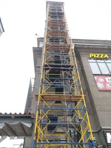 Вишка тура 20 метрів – пересувний аналог будівельних риштувань на колесах. Використовується для роботи на висоті. Конструкцію можна використовувати всередині приміщення для ремонту високих стель, наприклад, у школі або зовні будинку, для утеплення або реставрації.